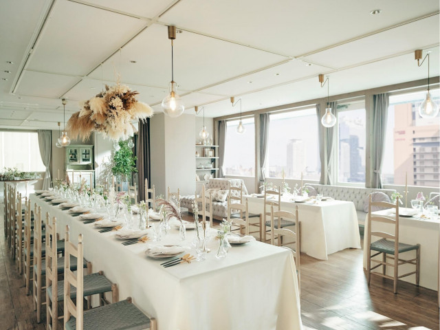 【パーティ会場『アフターリビング』】お家に招くようなアットホームなおもてなしが叶う、明るく開放的なパーティ会場。窓から自然光があふれるリラックス空間で、大切なゲストとの心温まる小さな集いを