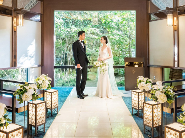 【 木漏れ日のチャペル 】祭壇奥一面の窓から見える、静寂な森。純白のドレスとのコントラストが美しい、アカガネリゾートのチャペルで、アットホームなセレモニーを体感。京都ならではの和婚式や神社式も案内可。