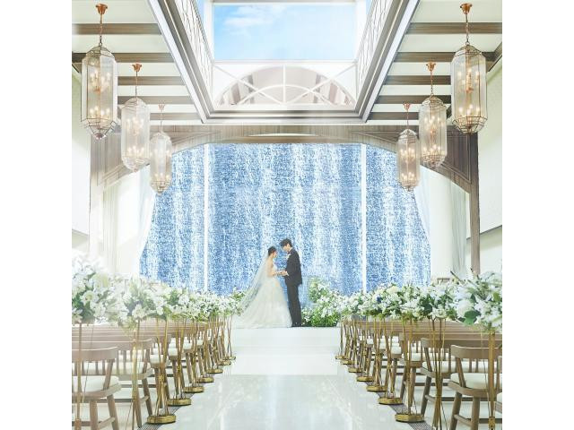 【リニューアル完成済!チャペル『カロレ』】”ぬくもり”をコンセプトに想いを紡ぐ時間に。水・光・緑の自然と調和した空間が感動のひと時を演出。天窓から差し込む自然光がおふたりの誓いを優しく見守ります。