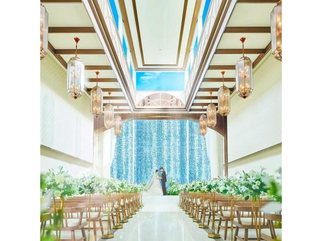 【リニューアル完成済!チャペル『カロレ』】”ぬくもり”をコンセプトに想いを紡ぐ時間に。水・光・緑の自然と調和した空間が感動のひと時を演出。天窓から差し込む自然光がおふたりの誓いを優しく見守ります。