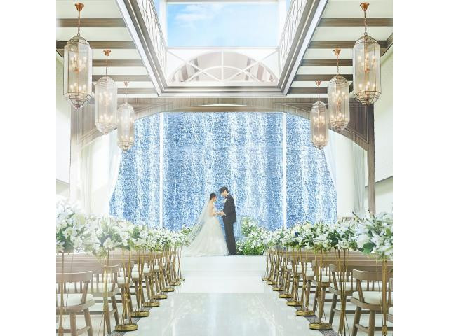 【24年9月リニューアルのチャペル『カロレ』】”ぬくもり”をコンセプトに想いを紡ぐ時間に。水・光・緑の自然と調和した空間が感動のひと時を演出。天窓から差し込む自然光がおふたりの誓いを優しく見守ります。
