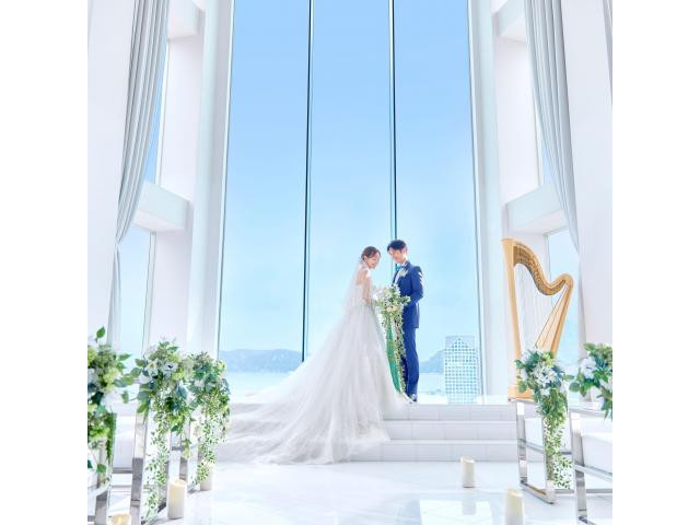チャペルリニューアル決定★【海と空をパノラマに望むチャペル】自然光降り注ぐチャペルの入場体験!ハープ・バイオリンの生演奏、チャペルムービーの感動挙式。リゾートの雰囲気と景色を楽しめる※140名着席可