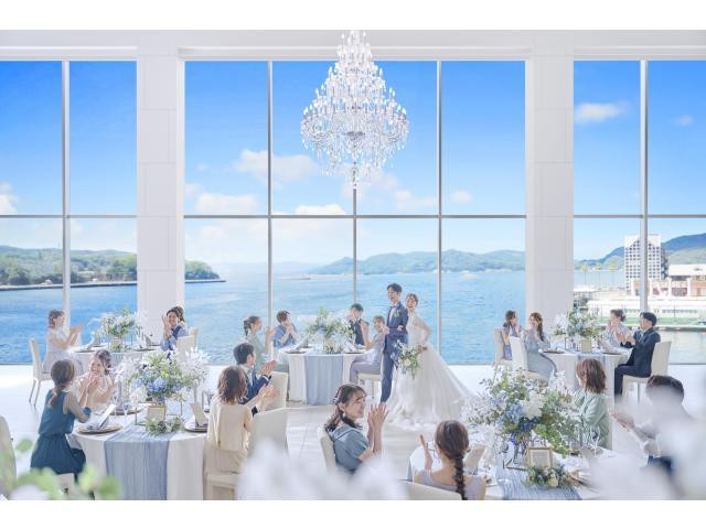 披露宴会場は、ガラス張りのオーシャンビュー!窓からは海と広大なロケーションを望め、更に貸切のガーデンなど幅広い演出が叶う♪