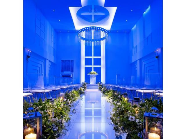 【先輩花嫁おススメの白亜とブルーチャペル演出】どんな天候でも明るく光り輝く白亜のチャペルと幻想的なブルーチャペルの演出を体験。結婚式の意味を聞いて、本番さながらの雰囲気でイメージしてもらえます♪