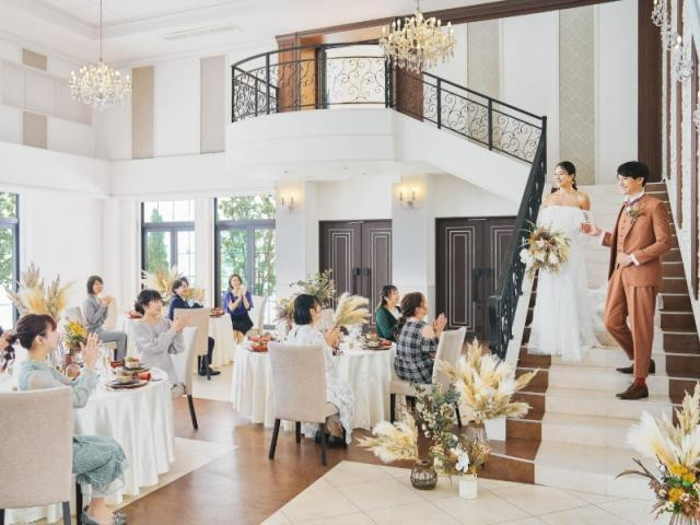 【披露宴会場での演出体験】天井高のある会場ならではの大階段からのドラマティックな登場はゲストからの注目を一身に集め大きな拍手に包まれる時間に。映画のヒロインのような気分をフェアで一足早く体感して