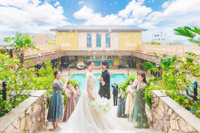 ガーデン演出 | 有りガーデンでのデザートビュッフェや、プールを使った演出もお楽しみいただけます。 |