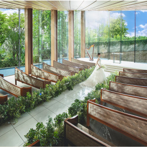 | おすすめ ポイント | 大きな窓を張り巡らせた開放感あるセレモニースペースでは、豊かな緑と水のせせらぎに包まれるナチュラルで優しい挙式が実現する。 |