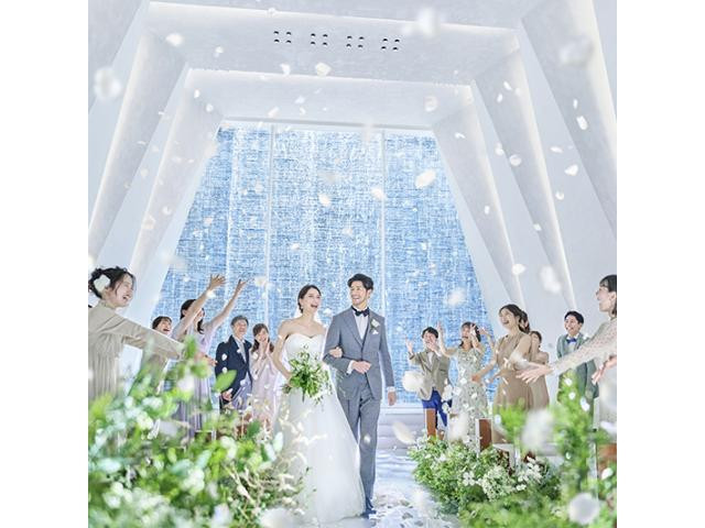 【口コミ府内高評価!自然光と水が織りなす、清らかな唯一無二の白亜チャペル】天候に左右されない完璧な光の中で、白を基調とした空間の正面には、優雅に流れ落ちる滝。まさに五感で感じる特別な空間です。