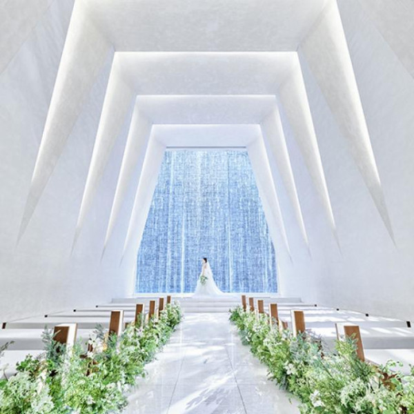 チャペル天井高8mの白亜のチャペル。キリスト式・人前式・神前式・和装人前式可。生演奏(ピアノ、フルート、バイオリン)も入り響き渡る音も貸切に。 (人前式、神前式の場合は162000円)