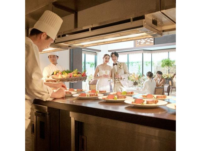 - 試食会- 【ゲスト満足度の高い料理】シェフがふたりにゲストへの想い・出身地・好みなどを聞きながら丁寧に創り上げます。1週間かけて仕込みを行い、当日はオープンキッチンから出来立てをご提供*ぜひフェアで味わって!