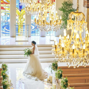 | おすすめ ポイント | ステンドグラスから差し込む暖かな日の光で バージンロードにお二人の姿を映し幻想的な雰囲気を演出いたします |