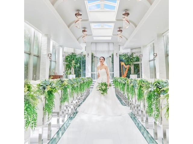 【光・緑・水のチャペル挙式体験】最上階にある白亜のチャペルは天井を含む4方向から自然光が射し込み、祭壇には水、両サイドに緑と、都心とは思えない開放的な空間。全天候型で季節や天候に左右されないのも◎