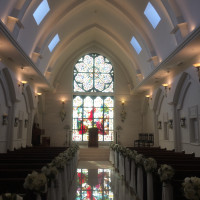 ステンドグラスが素敵で、バージンロードにも反射して写っていました。