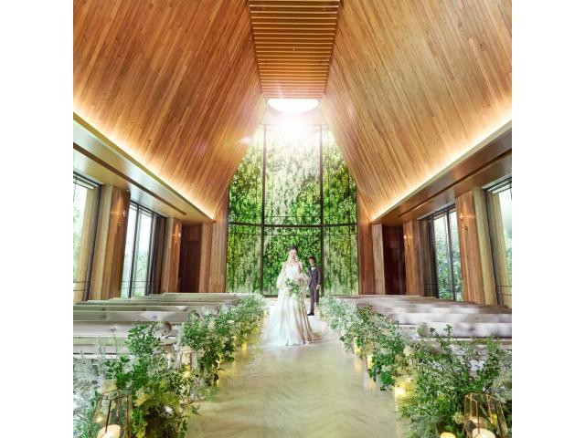 ◆天井高8mから降りそそぐ神聖な光に包まれる、緑と木の新チャペル。職人が丁寧に造り上げた、暖かみのあるアンティークガラスも魅力!