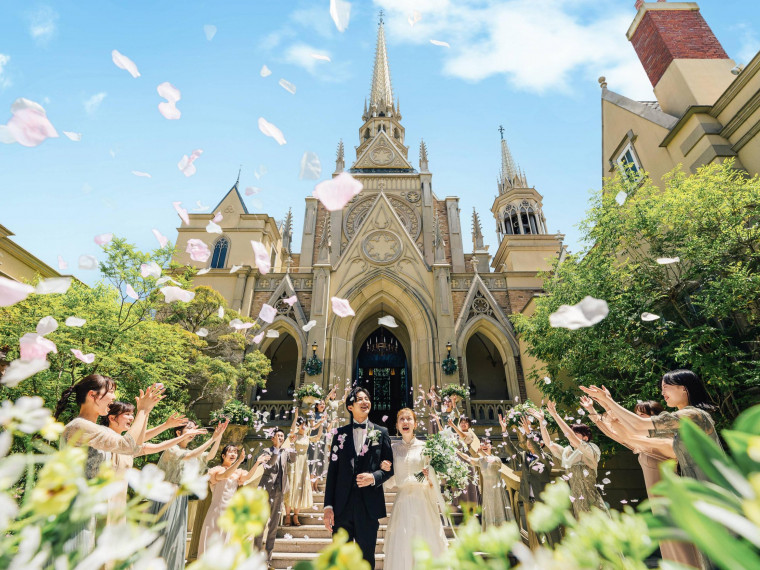 挙式後のセレモニーで行うバルーンリリースは、ゲスト全員が“せーの!”の掛け声で色鮮やかなバルーンを一斉に空に放つ特別な瞬間です。青空に舞うバルーン、緑に囲まれた庭、そしてアンティークな雰囲気の大聖堂――すべてが揃うここだからこそ叶う、誰もが心をひとつに感じる演出です。おふたりもゲストも、笑顔と感動で包まれる特別な思い出をお届けできます。