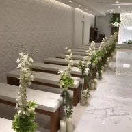 白を基調とした会場でした。キリスト・人前・神前式どれにも対応できるように作られていました。今までいろいろな会場をみてきましたが、ここが一番挙式会場がよくないと思いました。狭すぎてここでは挙げたくないです。詳細を見る (341文字)