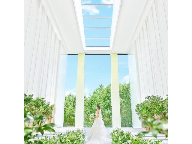 天井高12mから自然光が降り注ぐ明るいチャペルでは、挙式当日がイメージできる感動入場体験を行っていただけます。自然光が白亜の大理石に映りこみ、ゲストの皆様の記憶にも残る特別な空間。是非ご体感を♪