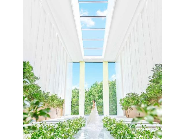自然光が差し込む天井高12mの真っ白なチャペル、窓から望む青空と緑が温かい雰囲気を醸し出します。
