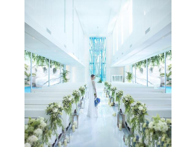 【リニューアルで大好評!水がきらめく☆リゾートチャペル】◆窓の外には水が流れ、水音が心地よいチャペル◆美しいブルーのステンドグラス◆挙式後は屋内大階段でフラワーシャワー ≪期間限定で挙式料プレゼント≫