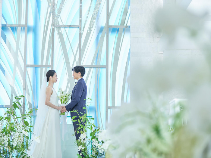 | おすすめ ポイント | 【水庭に浮かぶ楽園のチャペル】 白基調のチャペルに自然光が降り注ぐ。曲線の美しいブルーのステンドグラスや華やかなシャンデリアが印象的 |