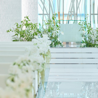| おすすめ ポイント | 【水庭に浮かぶ楽園のチャペル】 白基調のチャペルに自然光が降り注ぐ。曲線の美しいブルーのステンドグラスや華やかなシャンデリアが印象的 |