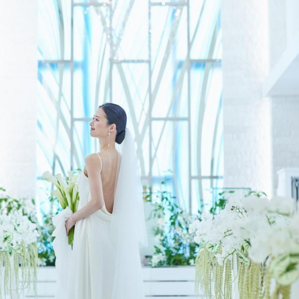| おすすめ ポイント | 【水庭に浮かぶ楽園のチャペル】 白基調のチャペルに自然光が降り注ぐ。曲線の美しいブルーのステンドグラスや華やかなシャンデリアが印象的 |