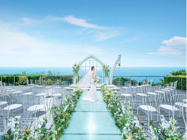 【水平線を一望できるシーサイドチャペル】相模湾を望む開放的な空間は、海と空をぐっと近くに感じさせてくれる。時間がゆったりと流れるような誓いのひとときを、ぜひ体験してみて*