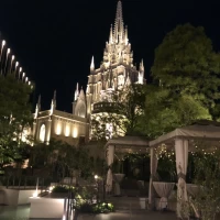 天井が高く、大きなステンドグラスが映える素敵なチャペルでした。外観もお城のように華やかです。チャペル前には大階段があり、フラワーシャワーや噴水の演出ができるのも魅力でした。