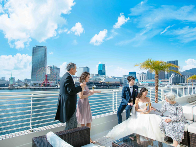 【目の前に広がる青い海と空!全会場が絶景を完備!】バルーンリリースやデザートブッフェなど様々な演出が叶うプライベートテラス付き!上質で温かな神戸リゾートウェディングを花嫁&ゲスト目線で体感できます♪