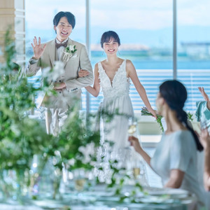 挙式会場は、雰囲気の異なる二か所から好きな方を選べます。落ち着いた格式高い印象のホールまたは、自然光の入る明るいチャペルです。どちらも、ホテルから離れた独立式なので、挙式後外で撮る集合写真が非常に映えます。独立式の場合、あいにくのお天気だと、移動が少し大変かもしれませんが、総合的に考えてメリットのほうが多いと思いました。設備に関しては、アクアホールは入場や退場時の歩みに合わせて、ガラスが徐々に曇ったりクリアになったりする仕掛けが非常に面白いです。また、天井からはポートタワーが見えます。マリンホールは、とにかく音楽が美しく響きます。天井がかなり高いので、外は見えませんが息苦しさは感じられません。こちらのホテルの披露宴会場の魅力は、なんといっても、大きな窓から海が拝めることではないでしょうか。海が大好きな方にとっては、絶好のロケーションです。披露宴中にテラスに出て、外の波風に吹かれるのがすごく気持ちが良かったです。ぜひテラスの時間を多めにとることをおすすめします。時間帯によって異なる表情の海や周辺の景色が楽しめるので、ゲストの人数や、好みの雰囲気に合わせて多くの会場から選べる点もおすすめです。今年、メニューの改定があったようです。1つランクアップしたコースにしましたが、品数・内容ともにゲストに満足していただけたようです。ドリンクメニューもプラン内のもので十分だと思います。三ノ宮駅からバスかタクシーでのアクセスになります。不便といわれる方もいらっしゃるかもしれませんが、まず駅前の繁華街ではこのような絶景の式は不可能ですし、ゲストの方々も足を運んでいただければこちらのホテルの良さが分かっていただけますので心配ないかと思います。皆様素晴らしいご対応で、終始安心出来ました。少しでも疑問に思った点や質問があれば、すぐに聞くことをお勧めします。自身のこだわりや、希望に対する対応力のすばらしさ。細かい点ですが、打合せ時のドリンクがとっても美味しいところも嬉しかったです。準備の段階は、地道な作業も多く、しんどい時も出てくるかと思います。結婚式は2人だけの問題ではなく、両親などのアドバイスも聞かないといけないタイミングも出てくるかと思いますが、ここは譲れないというポイントは突き通して良いと思います。喜怒哀楽ありますが、必ず、結婚式当日は最高の日になります。途中でめげずに、当日を是非めいいっぱい楽しんでほしいです!!詳細を見る (1014文字)