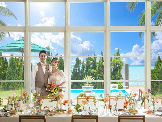 【沖縄リゾートを感じるアイテムや演出の数々】琉球食材をつかったオリジナルコース料理や、三線のの生演奏と共にゲストと沖縄伝統カチャーシーを楽しむなど、沖縄でしか味わえない結婚式をご提案致します。