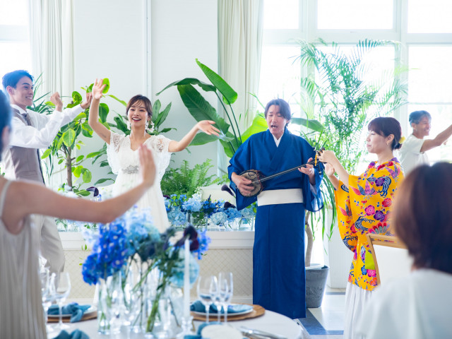 【沖縄リゾートを感じるアイテムや演出の数々】琉球食材をつかったオリジナルコース料理や、三線のの生演奏と共にゲストと沖縄伝統カチャーシーを楽しむなど、沖縄でしか味わえない結婚式をご提案致します。