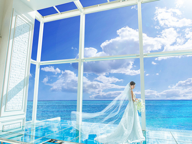 【必見!水の祭壇チャペル】人気・北谷エリアの白亜のチャペル。透明感のある床下には水が流れ青空が映り込む「水の祭壇チャペル」をVR見学。6名以上挙式&会食で基本挙式料全額プレゼントなどBIG特典付き!