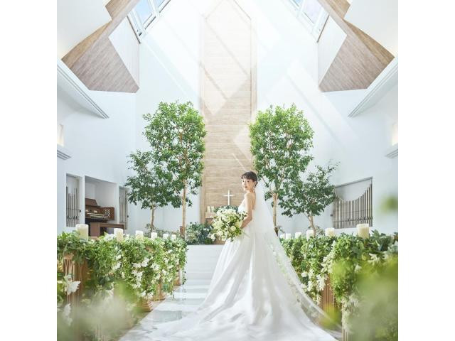 【緑と光溢れるチャペル。感謝の気持ちを伝える時間】祭壇には高さ4mのシンボルツリー、天窓から射し込む自然光が挙式シーンをより印象的に演出。チャペルでの入場体験などナチュラルウエディングを体感できます