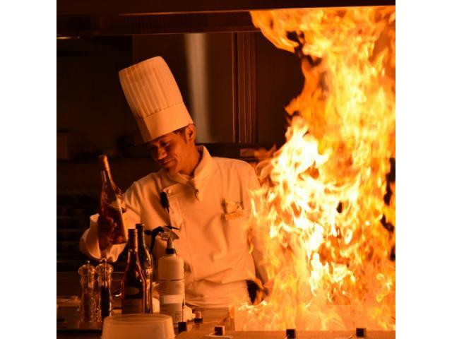 【ゲストへのおもてなし】自慢のフルオープンキッチンから「出来立てを適温で」を心掛ける料理はゲストからもきっと褒められる♪フランベショーの演出も大好評!
