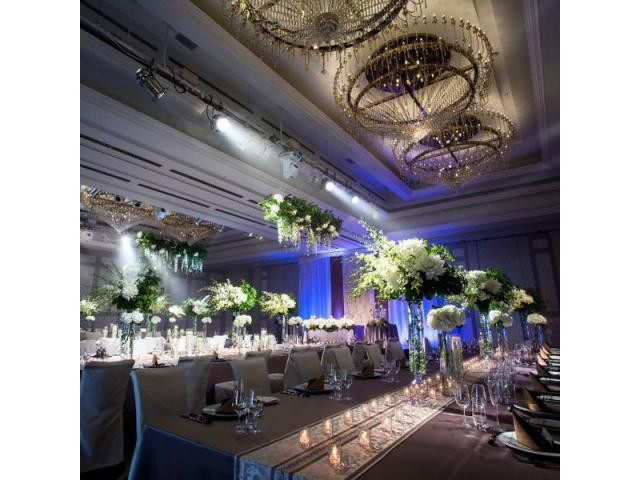 5.5mもの高さを誇るパーティ会場は、ラグジュアリーかつ開放的。煌めく壮麗なシャンデリアが空間に華やぎと上質を添えます。招待する人数やパーティのスタイルに合わせて、様々なコーディネートをご提案。