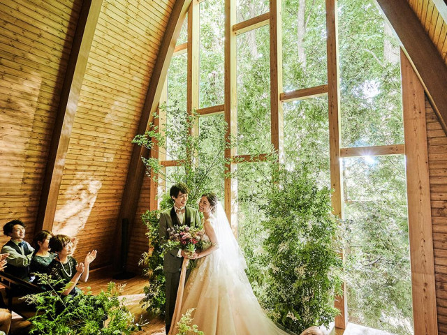 [森のチャペル]おふたりが永遠を誓う挙式は、大切なゲストに見守られながら自由なスタイルで。新たに誕生する森のチャペルでは優しい光と木のぬくもりに包まれ、厳かな教会式やアットホームな人前式が叶う。