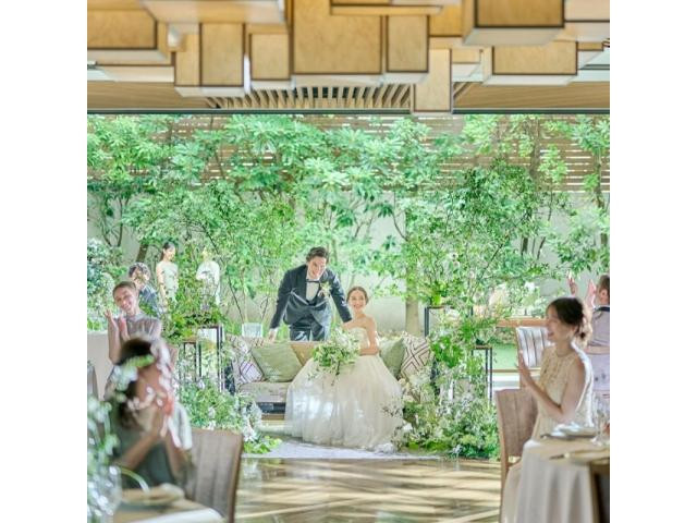 【オープンキッチン隣接のパーティ会場:10~120名】パーティ会場はガーデン併設なので美しい緑を背景にテラスからの入場も可能◆木目調のぬくもり溢れる会場でゲストと楽しい時間を過ごせる空間を体験しよう*