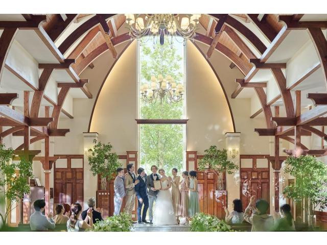 【天井高9m!木のぬくもりに包まれる独立型チャペル】やわらかな陽光がふりそそぎ、開放感に満ちたチャペルが人気♪◆感動のセレモニー体験 ◆ゲストへ感謝のきもちが伝わるプログラムをご紹介