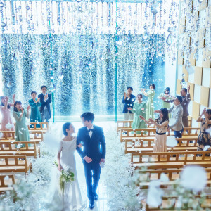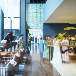 扉が開くと、やわらかな光が差し込む空間が広がっていました。木の椅子が並び、自然な温もりが漂います。天井から吊るされた透明の装飾が、光を受けて静かにきらめき、空気まで澄んでいるように感じました。パイプオルガンの音色は深く、ゆっくりと胸に染み込んでいきます。視線を上げると、そこには大切な人たちの笑顔があり、その存在が式全体を包み込むようでした。言葉よりも、場の空気そのものが記憶に残る、そんな時間でした。会場に入った瞬間、視線が自然と上へと向かいました。高く広がる天井が、空間にゆとりを与えてくれます。奥には大きな窓があり、そこから差し込む光と庭の緑が、室内にやわらかな彩りを添えていました。階段からの入場は、まるで映画のワンシーンのようで、歩みを進めるたびにゲストの表情が近づいてくるのが嬉しかったです。映像演出も印象的で、大きなスクリーンに映し出された映像が、会場全体をひとつにしてくれたように感じました。人数の多さを忘れるほど、開放感と温かさが同居する空間でした。会場は駅から歩いてすぐの距離にあり、迷うことなく辿り着けました。周辺には飲食店やバーが多く、披露宴後の二次会にも自然と流れやすい立地です。車で訪れるゲストには駐車場が用意されており、パーキングチケットのサービスもあって安心。遠方からの出席者も、地元の友人も、それぞれに便利さを感じられる場所でした。打ち合わせのたびに感じたのは、スタッフの方々の落ち着いた物腰と、こちらの想いを丁寧に汲み取ってくれる姿勢でした。ヘアメイクも装花も、それぞれの分野で経験を重ねた方が担当してくださり、言葉にしきれないニュアンスまで理解して形にしてくれる安心感があります。迎えた当日、鏡越しに映った自分の姿も、会場を彩る花々も、思い描いていた通りで、胸の奥がふっと温かくなる瞬間がありました。準備の時間から式の終わりまで、ずっと信頼できる人たちに囲まれていたことが、何よりの贅沢だったと思います。振り返ってみると、ペーパーアイテムやムービーの準備は、もう少し早く取りかかればよかったなと思います。こだわりたい気持ちが強くなるほど、細かい調整や確認に時間がかかってしまって…。直前は他の準備とも重なり、少し慌ただしくなりました。余裕を持って進められていたら、もっと心穏やかに当日を迎えられたかもしれません。詳細を見る (975文字)