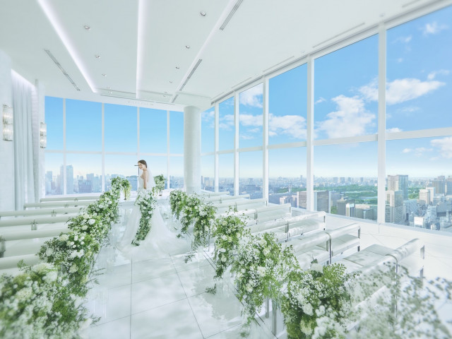 【東京タワー一望のスカイチャペル】地上215mで東京タワーや皇居を眺められる贅沢な空間。ガラス一面から自然光がたっぷりと差し込む天空チャペル。東京の夜景が広がるナイト挙式では上質で感動的なひとときを。
