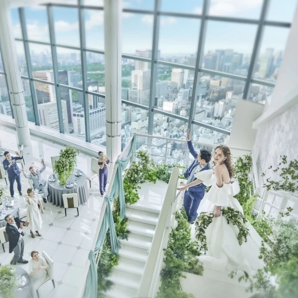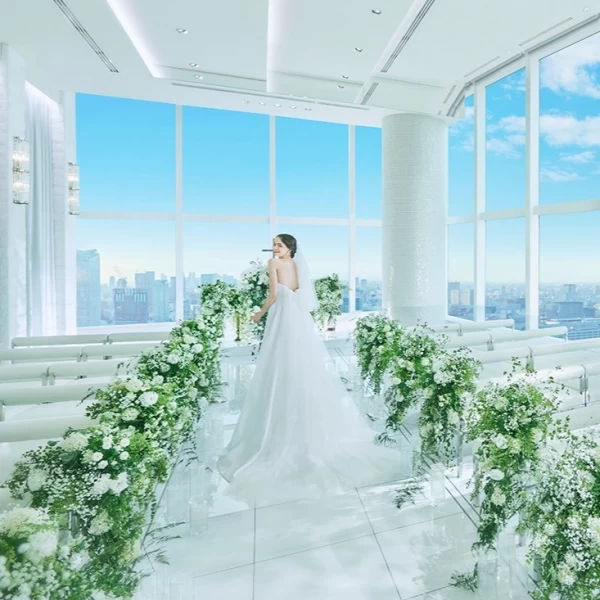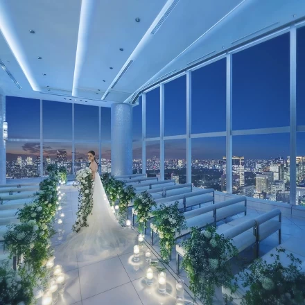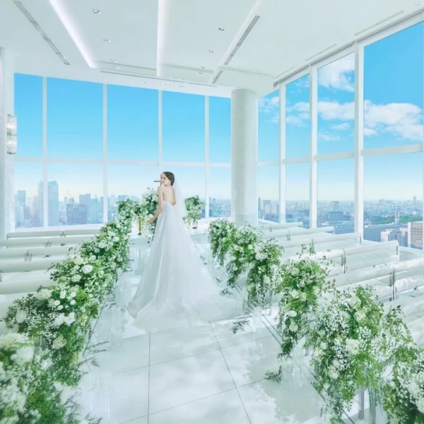 2面の窓からは、東京のランドマークが一望できる開放的なチャペル。(キリスト教式 200,000円)