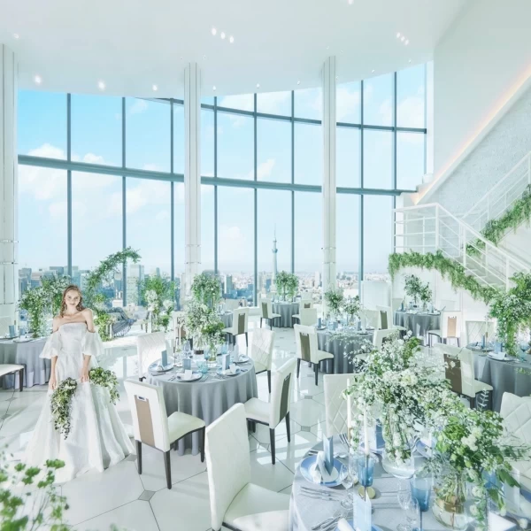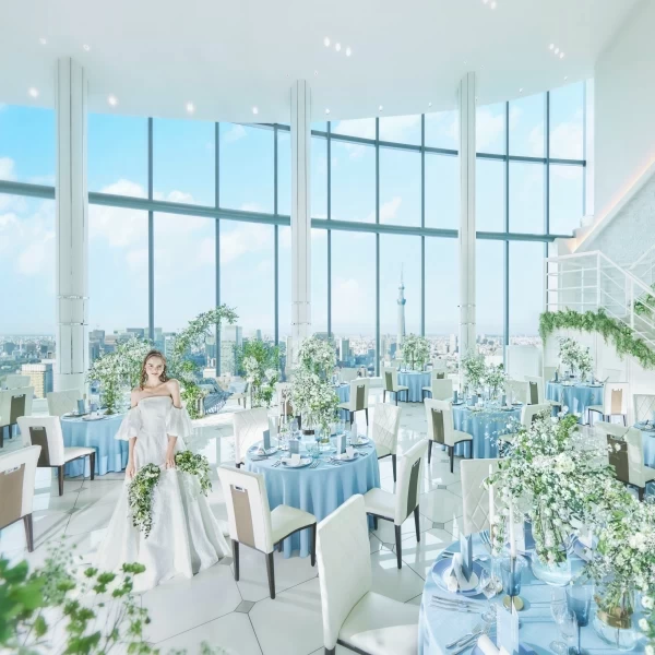 天井高13mの開放感溢れる白基調の会場。メインテーブルの後ろにスカイツリーがそびえ立ちます。