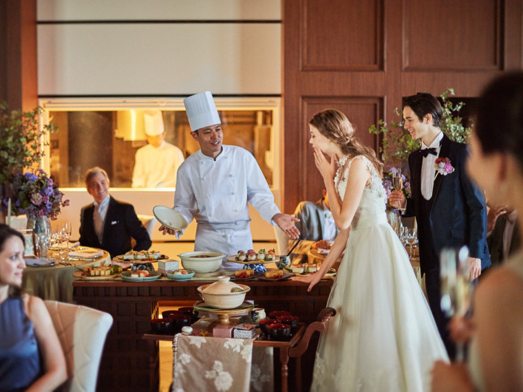 年齢や性別を問わず幅広い方々が集まるご結婚式だからこそ、慣れ親しんだ日本料理の技法を大切に。そして一生に一度の晴れ舞台にふさわしく、目にも華やかなフレンチを融合した「ヌーベル キュイジーヌ ジャポネ」でのおもてなし。