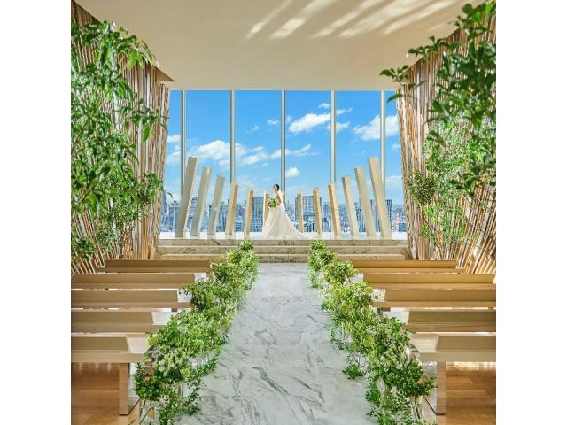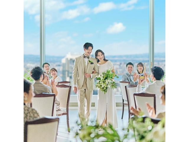 【大阪一望パノラマビュー×感動の天空チャペル体験♪】自然光が降り注ぐ地上160mの圧巻の景色!絶景と生演奏の音色が響き渡る感動の挙式でお世話になった家族や大切な人たちへ感謝の気持ちが伝わる挙式を体験!
