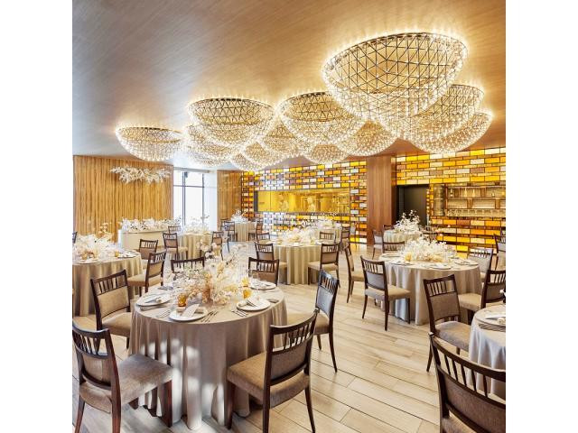 【オープンキッチン隣接のパーティ会場:2~110名】ブラウンを基調に煌めくシャンデリアを備えた落ち着いた雰囲気のパーティ会場。オープンキッチンのライブ感や最新の音楽設備、大型スクリーン等を体感!