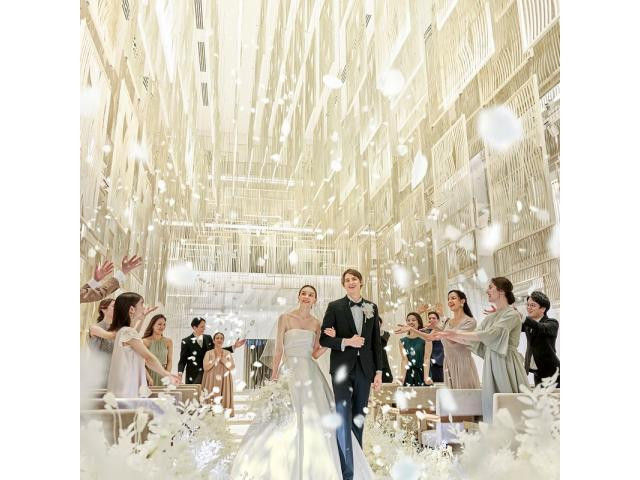 【天井高8M!花嫁が美しく輝くチャペル】洗練されたチャペルに連なる木製オブジェは「想い出のフィルム」と「扉」がモチーフで挙式をドラマティックに演出。そんなデザイン性豊かなチャペルで入場体験も