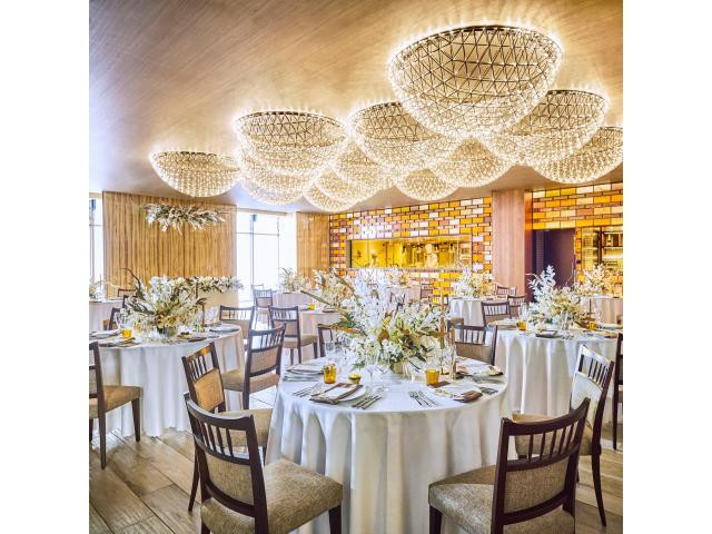 【オープンキッチン隣接のパーティ会場:2~100名】◆ブラウンを基調に煌めくシャンデリアを備えた落ち着いた雰囲気のパーティ会場◆オープンキッチンのライブ感や最新の音楽設備、大型スクリーン等を体感!