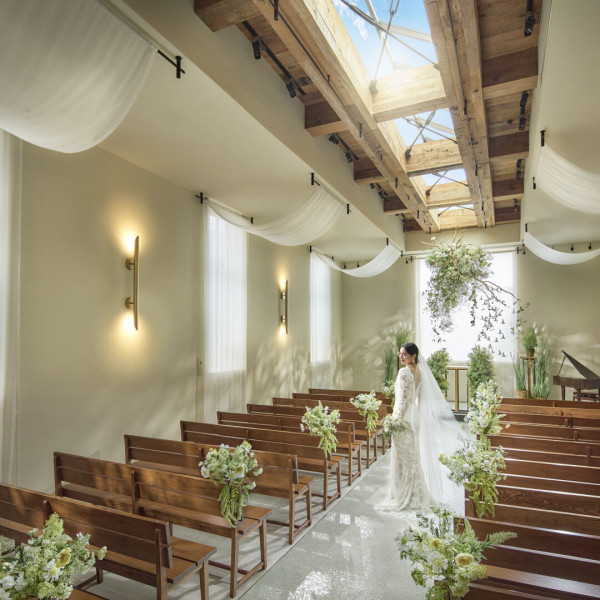 おすすめ ポイント | 一面ガラス張りで天窓もあるチャペルは、光溢れる明るい空間。天井に吊られた植物やシェルタイルのバージンロードがナチュラル な雰囲気を醸します。 |
