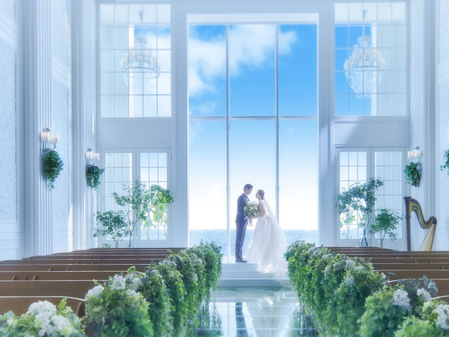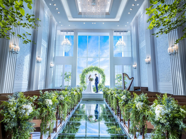 地上100mからの圧巻の眺望、天井高7mの壮大なスケールが自慢のチャペル。ゲストの皆様の祝福に包まれる、思い出に残る挙式をプレゼント☆ 【165,000円相当】